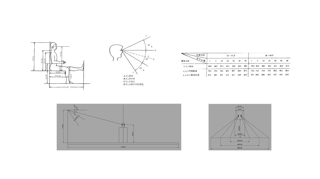 由于需要放置在桌面使用,设计前期的人体工学研究主要针对坐姿的一些数据,并由人体工学数据推导出产品摄像头高度、镜头遮挡区域、整机大概尺寸等等数据,为后续设计作支撑。