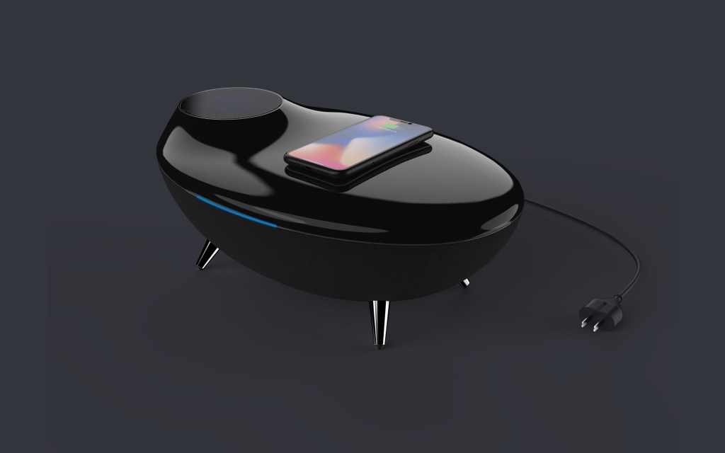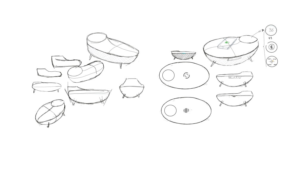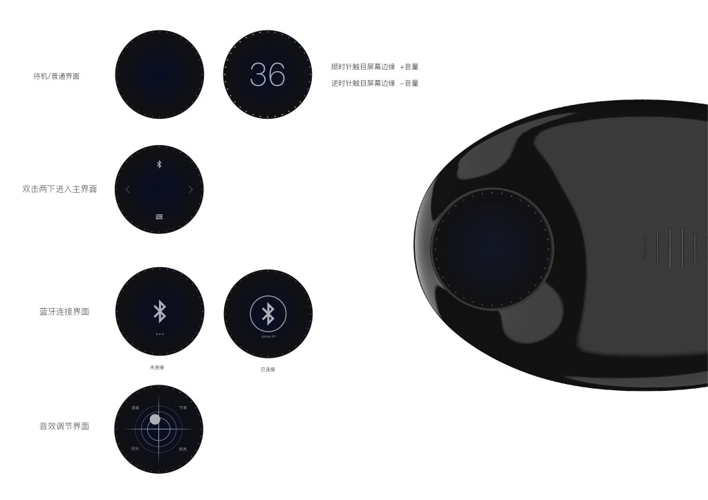 产品是一台蓝牙音箱,尝试用设计艺术品的思路进行设计,并融合一些建筑设计的造型思路。平滑连续的曲面,通过上下分件、材质的区分形成宛如天和地的区分。上部分含有屏幕和无线充电区域,下部分为音箱共鸣腔体。